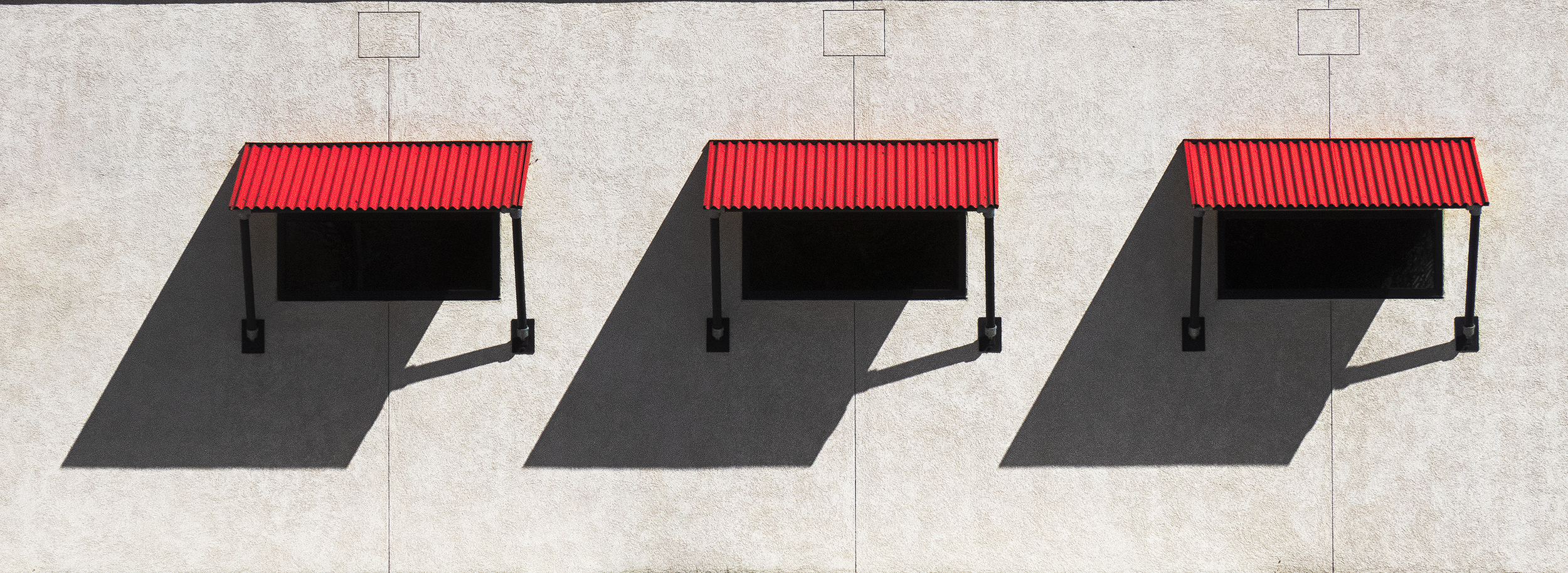 The sharp, angular shadows are not secondary—they are equal partners to the architecture. They introduce tension and direction, cutting diagonally across the otherwise flat, rectilinear surface. The contrast between the bright wall, deep shadow, and red awnings gives the image clarity, depth, and graphic strength, turning a simple façade into an abstract study of balance and restraint.
