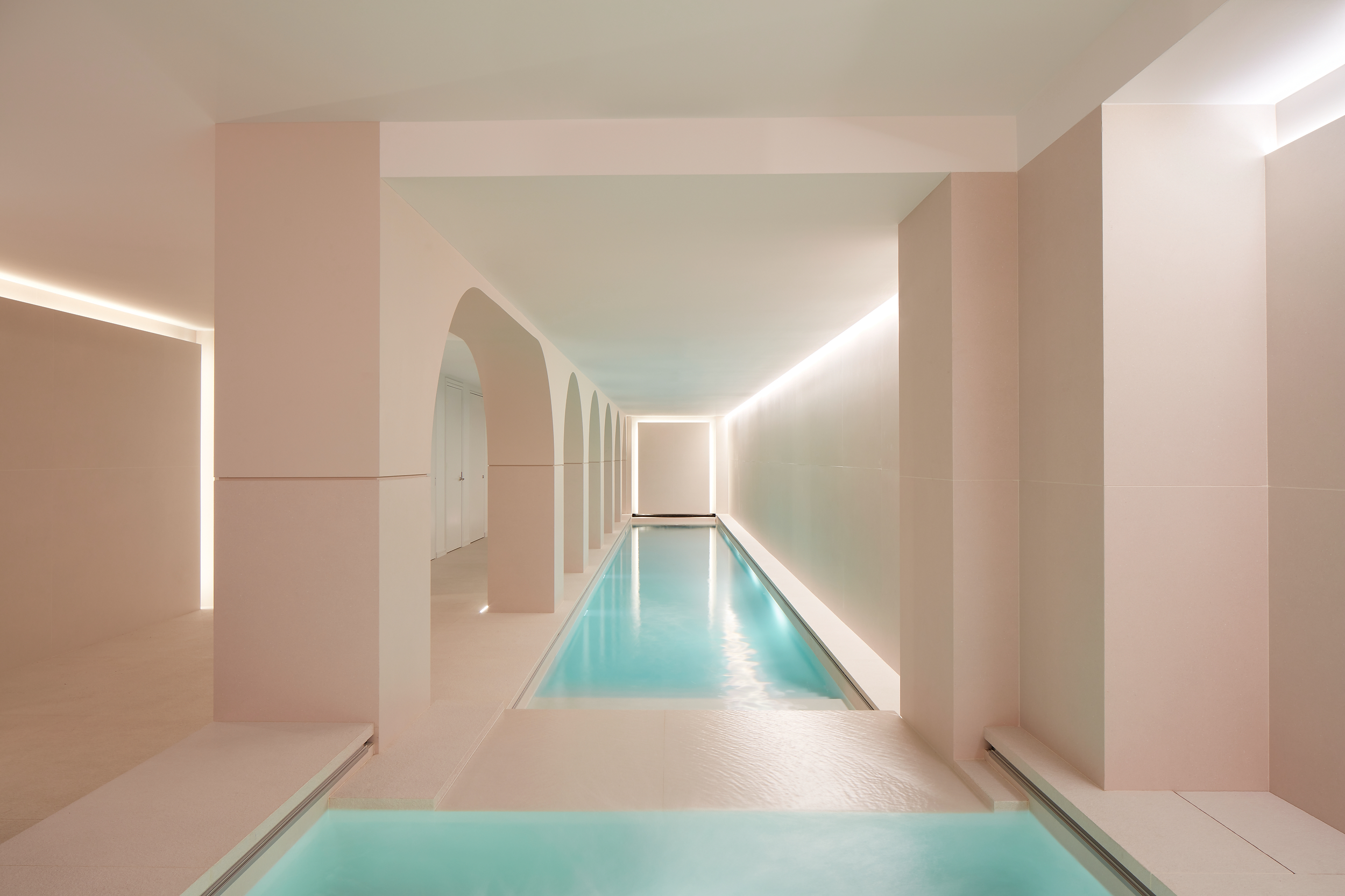 This peaceful townhouse pool in a Central Park West cellar is one level below the basement. The house and the pool are thoroughly renovated and updated by William Leeds, a residential architect. Energy-efficient new lighting gives a spa feeling. For ceiling coves, LED strips that shift through a range of moods. Steady warm-white light is possible, or a computer control produces any of 16 million distinct colors.