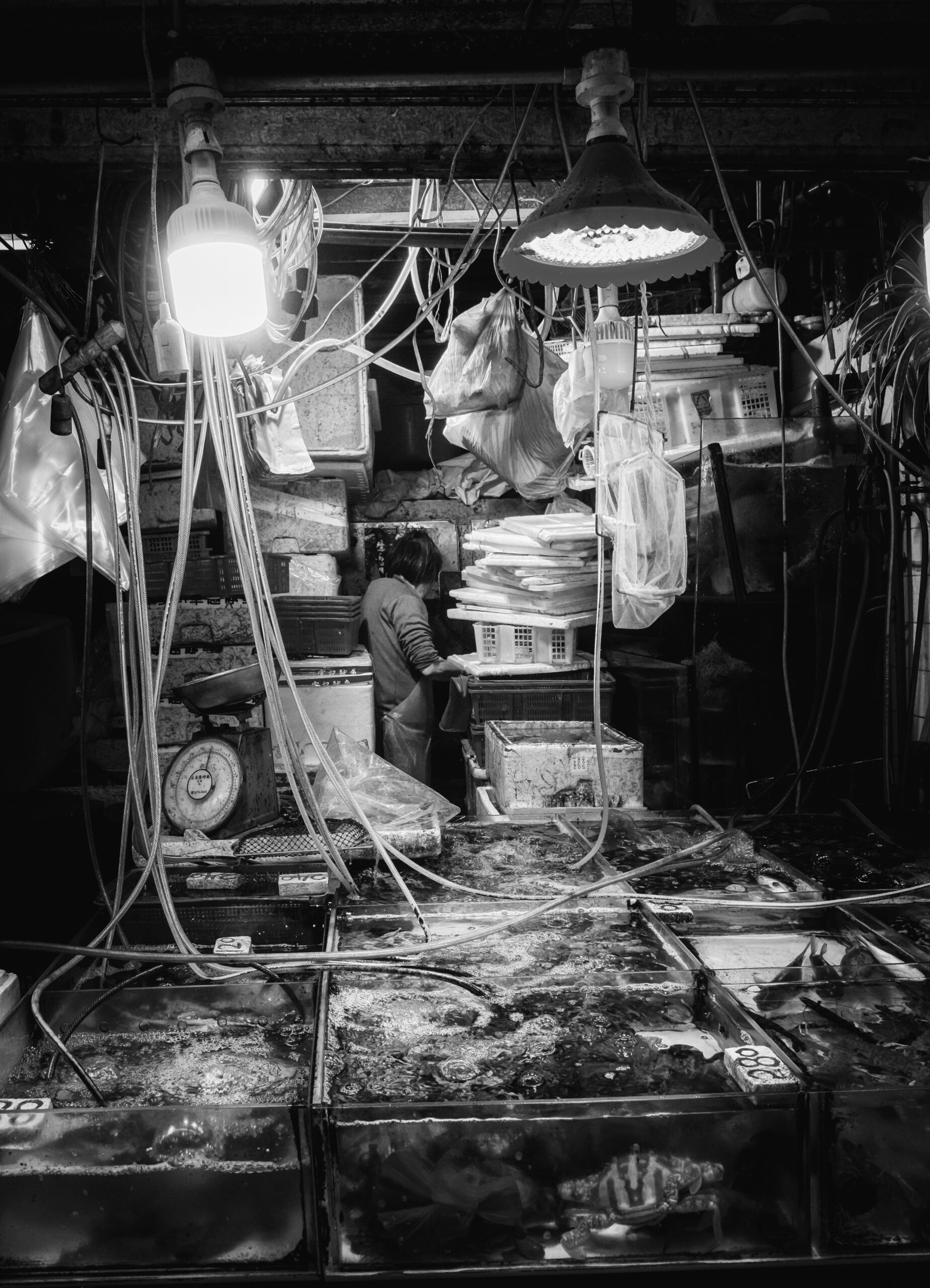One impactful feature for me is the number of items in that small stall. The hose, tanks, styrofoam, bags, trays, etc. The other counterbalancing element has got to be the human presence, right in the center, the lady, faceless, minding something in the back.